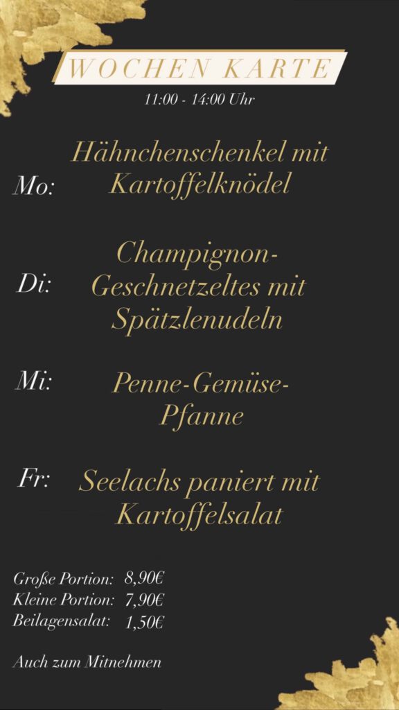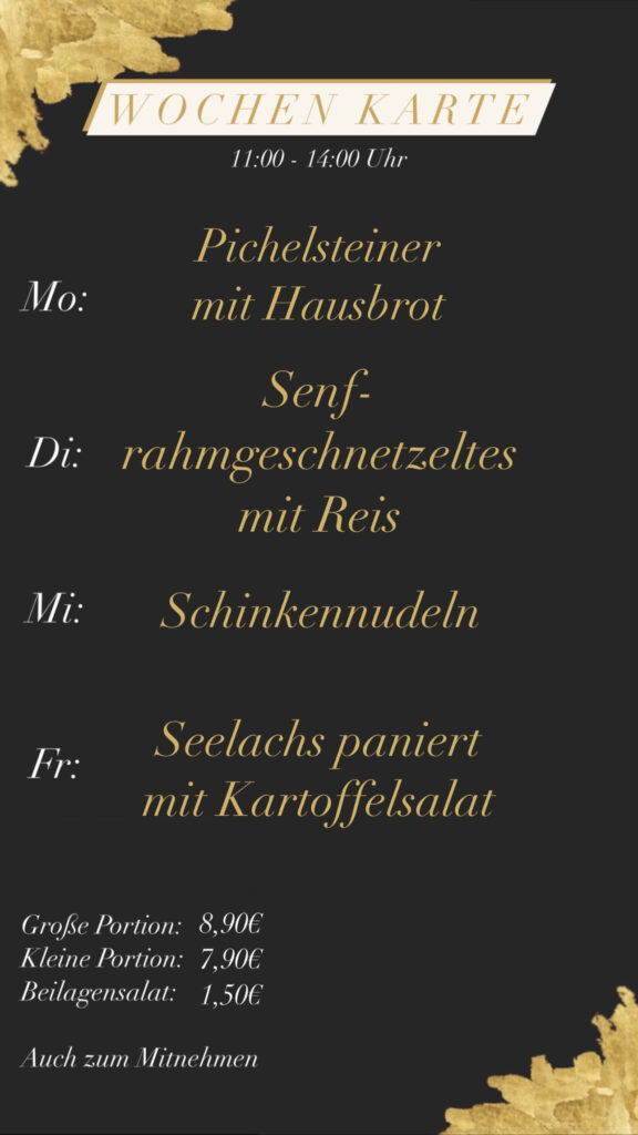 Von Montag bis Freitag (ausgenommen Donnerstag, unserem Ruhetag) bieten wir ab 11 Uhr ein täglich wechselndes Mittagsgericht – so lange der Vorrat reicht! Das aktuelle Menü finden Sie weiter unten oder im entsprechenden Story-Highlight auf unserem Instagram-Account @siebenhandl_osterhofen.